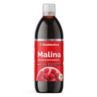 Malina Ekamedica to suplement diety w formie płynnej, wyprodukowany wyprodukowany z soku 100% z owoców malin z dodatkiem witaminy C naturalnego pochodzenia, pochodzącej z ekstraktu z owoców camu camu. Pasteryzowany.